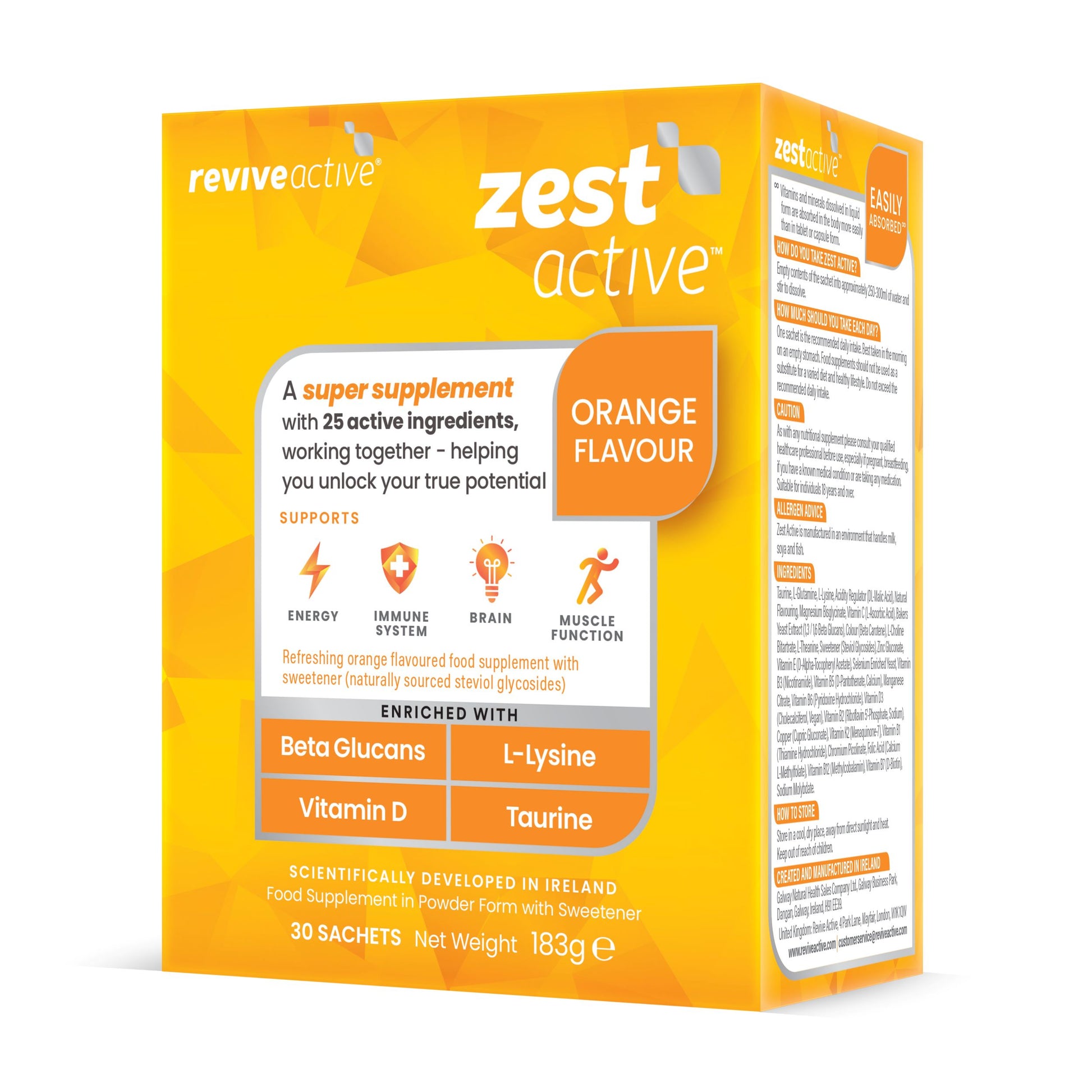 Zest Active is a super supplement with 25 active ingredients formulated for adults (aged 18 and over) who want to support their immune system and energy levels. Delivering multiple benefits in one easy sachet, every single ingredient was carefully selected to help you unlock your potential.